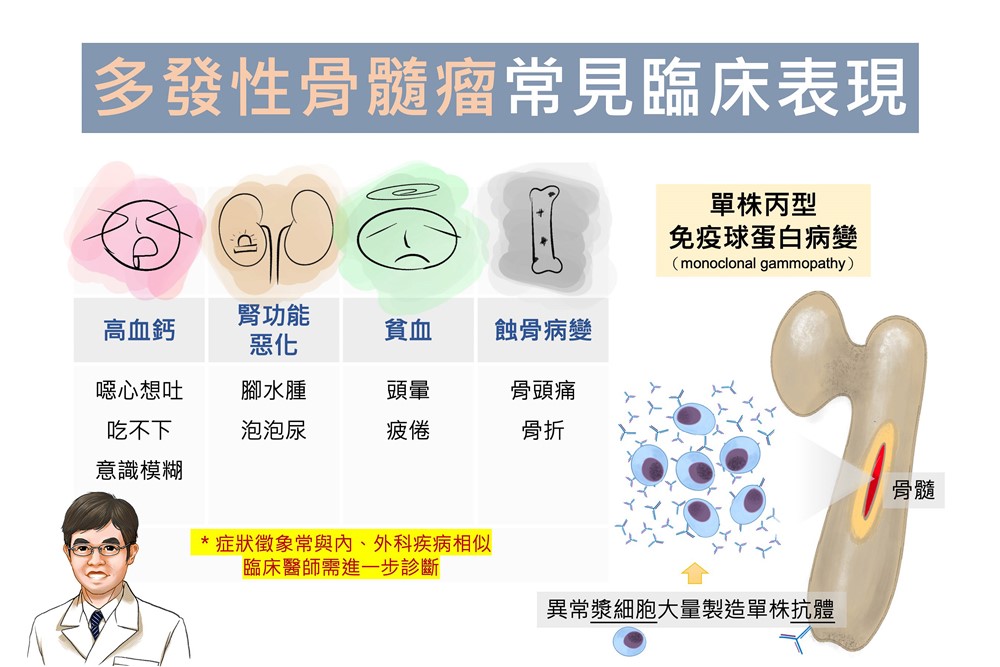黃冠博醫師指出,多發性骨髓瘤臨床症狀表現很多元,包含高血鈣、腎功能惡化、貧血和蝕骨病變,因為症狀徵象常與其他內外科疾病相似,臨床醫師診斷其實並不容易,需要多種血液檢驗、影像醫學和骨髓檢查,來確定疾病範圍和嚴重程度。黃醫師提醒,若有類似骨髓瘤常見症狀,經評估治療遲遲未改善、或找不到原因甚至惡化,就要有所警覺,尋求進一步的檢查來診斷,才能對症處置。