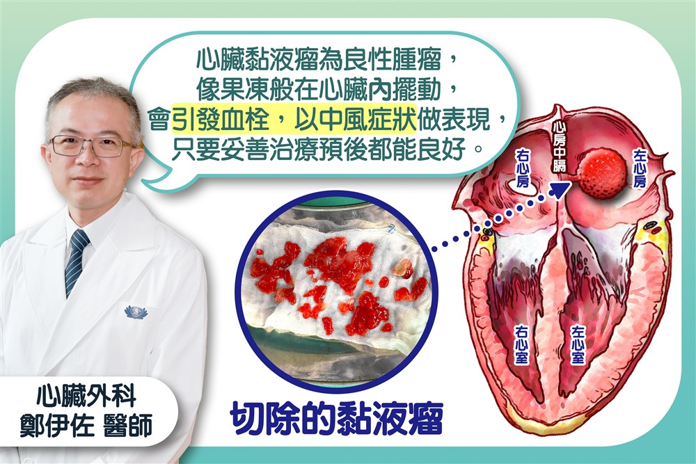 台中慈濟醫院心臟外科鄭伊佐醫師說明,心臟黏液瘤為良性腫瘤,像果凍般在心臟內擺動,會引發血栓,以中風症狀做表現,只要妥善治療預後都能良好。