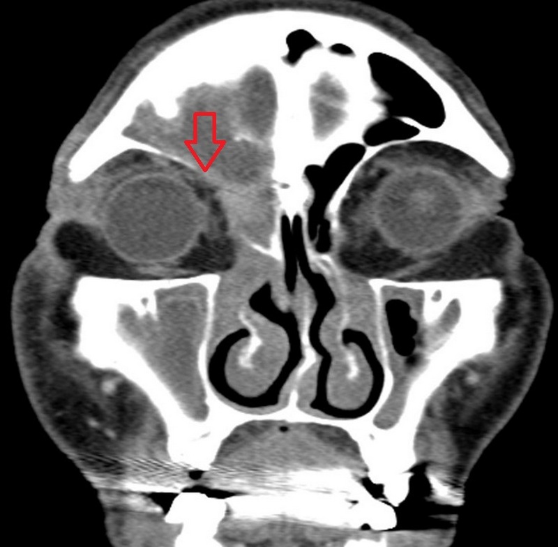 急診醫師排除是眼科的疾病後,由耳鼻喉科吳姳萱醫師收治,李先生的電腦斷層檢查結果顯示,原來是鼻竇黏膜腫脹,導致鼻竇開口阻塞,然後影響到眼睛周圍出現膿瘍的情形,診斷為急性鼻竇炎併發右眼上皮膿瘍。