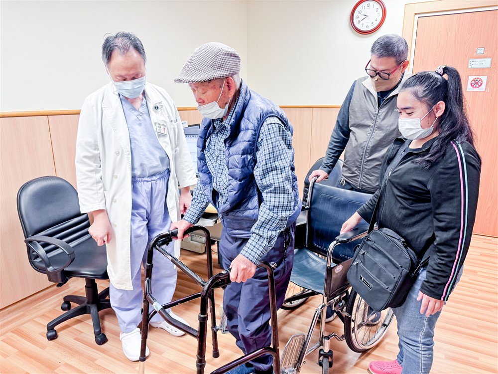 九十八歲張爺爺(左二)因心臟衰竭導致行動困難,台中慈濟醫院心臟外科主任余榮敏(左一)透過EECP 體外加強反搏療法,幫助他恢復日常活動能力。