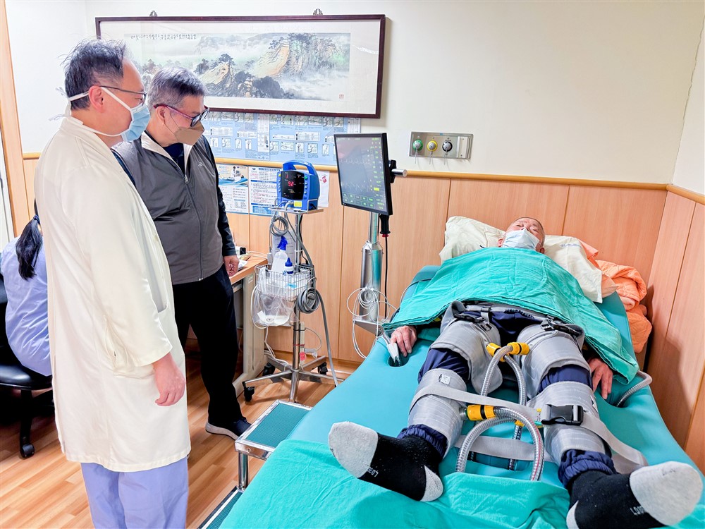 EECP 治療過程中,心臟外科主任余榮敏(左一)持續監測病人生命徵象,依實際狀況調整治療參數,提升整體療效與安全性。