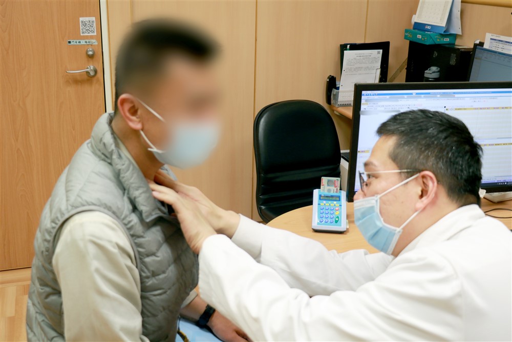 台中慈濟醫院內分泌外科高國堯主任為病人檢查甲狀腺。甲狀腺癌的病人初期沒有不適感,多半是透過醫師觸診或健檢才發現。