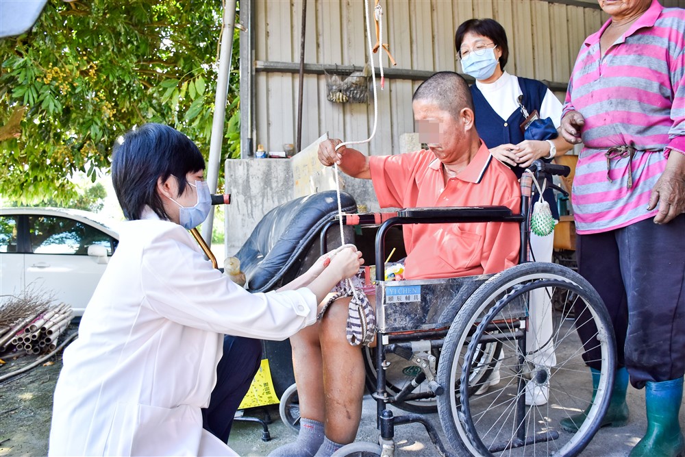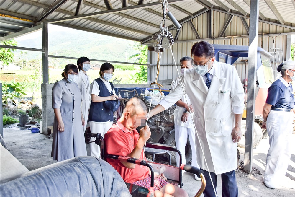 獲得院長支持後,一行人決定選在端午節前夕前往探視。抵達時,林先生在用滑輪吊環做復健,雖然他因氣切表達困難,始終不發一語,但接收到眾人的關心情緒激動,尤其聽母親說著養家的日常,林先生的淚水流個不停。院長觀察到綁在林先生腿上的布巾材質及寬度不適用,磨擦恐造成皮膚破皮,建議母親更換魔鬼氈材質,更方便解開也不易造成皮膚不適;林芳竹醫師則教導個案可將下肢抬高,改善水腫情形。