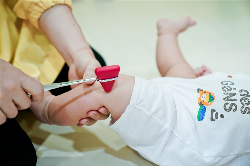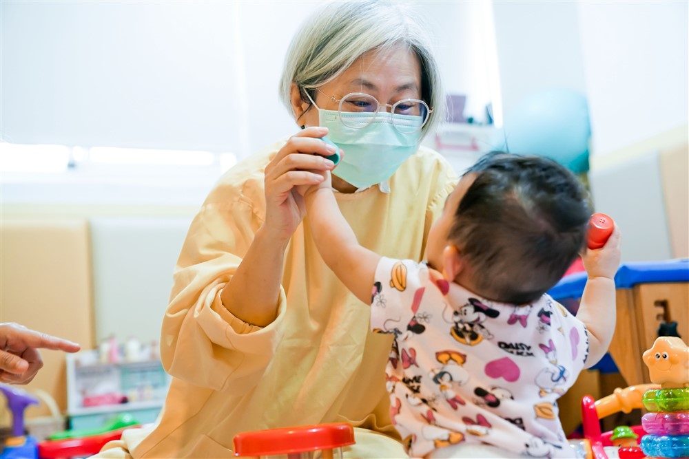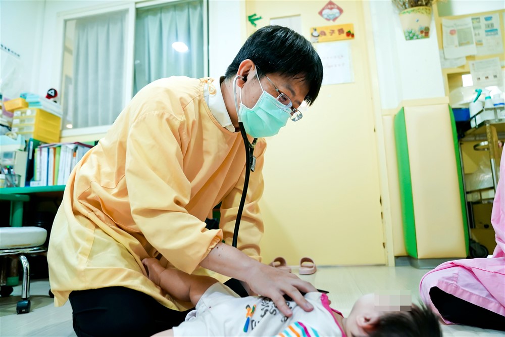 「他看起來有些異位性皮膚炎,而且平常是不是比較少趴著?」替寶寶看診的王緒斌醫師仔細地檢查身體,不時詢問。育幼院的媽媽則針對每個問題即時回應:「對,他的頭皮還有一些脂漏性皮膚炎。我們會讓他趴著,但會用小枕頭或毛巾墊在下面⋯⋯」將小寶寶的頭轉轉左邊、轉轉右邊,翻翻身體、動動雙腳,寶寶馬上像是被逗樂般露出笑容。