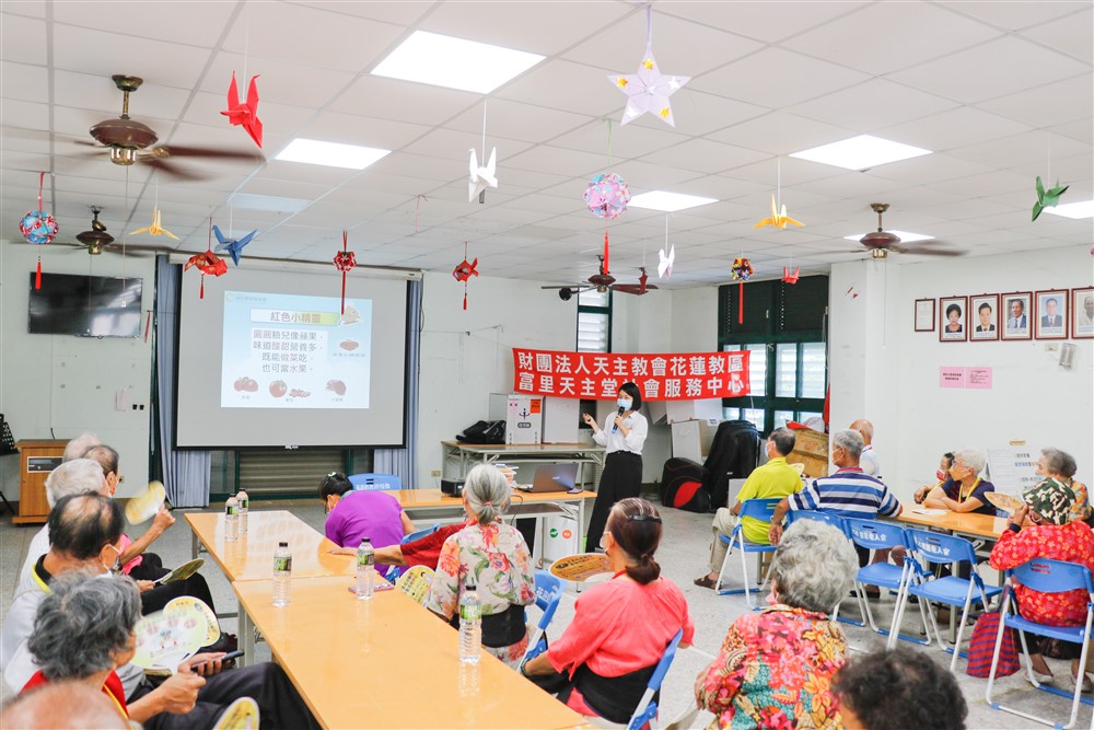 八月二十五日,玉里慈濟醫院劉育汝營養師來到富里鄉天主堂,以「吃真好食物,打敗癌魔王」為主題,與長者交流如何分辨天然食物與加工食品。
