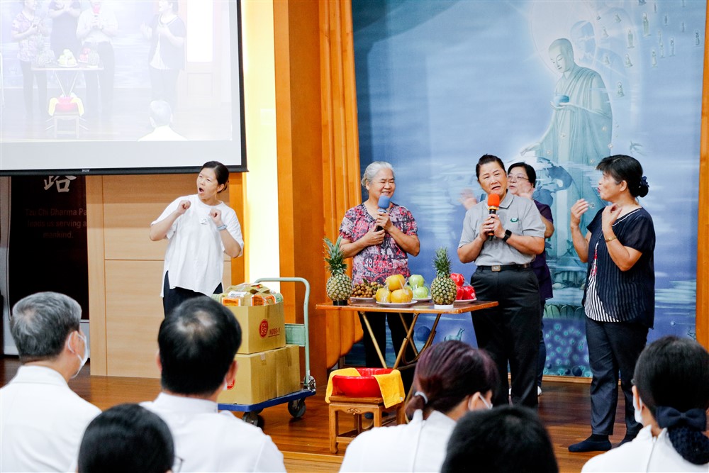 社區師兄師姊透過手語表演短劇「轉迷為悟」,演繹在普渡時殺生焚燒大量紙錢的迷信,上人說,善門鬼門都在我們自己的心中,不好的習氣造就惡果,不要起了迷信亂了方向。