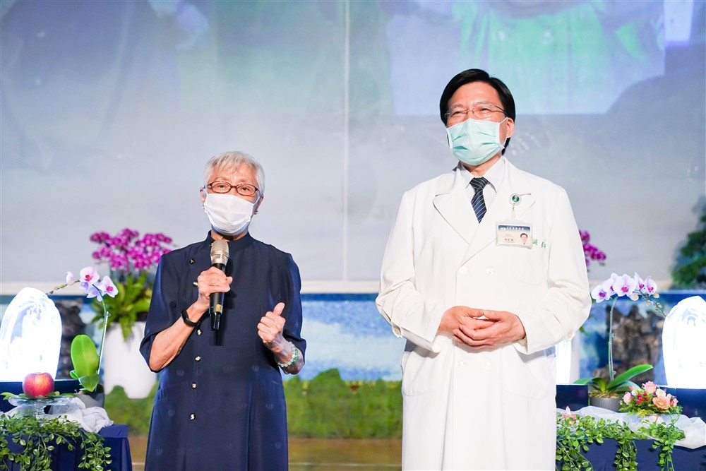 趙有誠院長(右)感恩精舍師父從花蓮將祝福帶來台北慈院,紀陳月雲師姊(左)以上人開示呼籲眾人用正念破除迷信。攝影/盧義泓