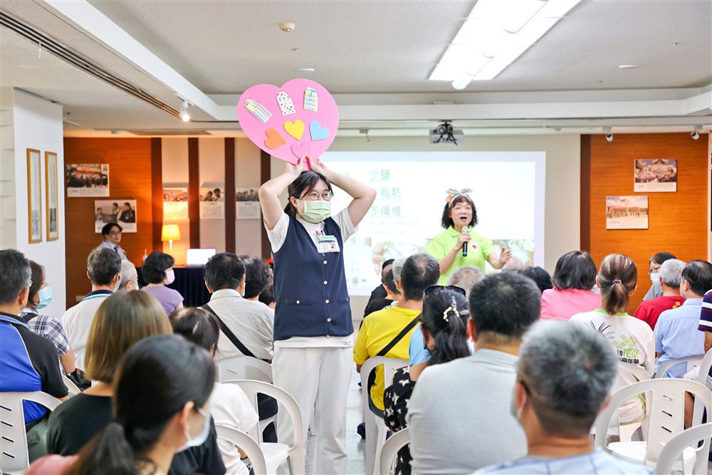 現場也安排個管師與營養師分享預防心血管疾病的保健須知,並進行有獎徵答活動。著綠衣者為慈濟大學護理系謝美玲老師。