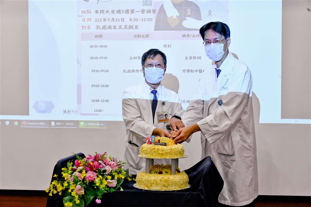 大林慈濟醫院腫瘤中心主任洪世凱(右)與副主任林俊宏(左)一起切蛋糕慶祝腫瘤中心二十周年。