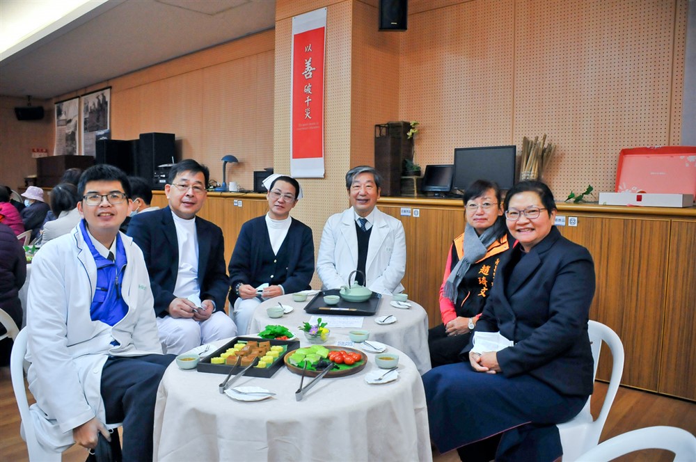 歲末祝福開始前,社區志工特別安排與會者溫馨座談。左起為張文駿醫檢師、葉雲鑑副護理長、潘璿晴護理長、李晉三醫師、趙琦文里長、楊寶鳳師姊。