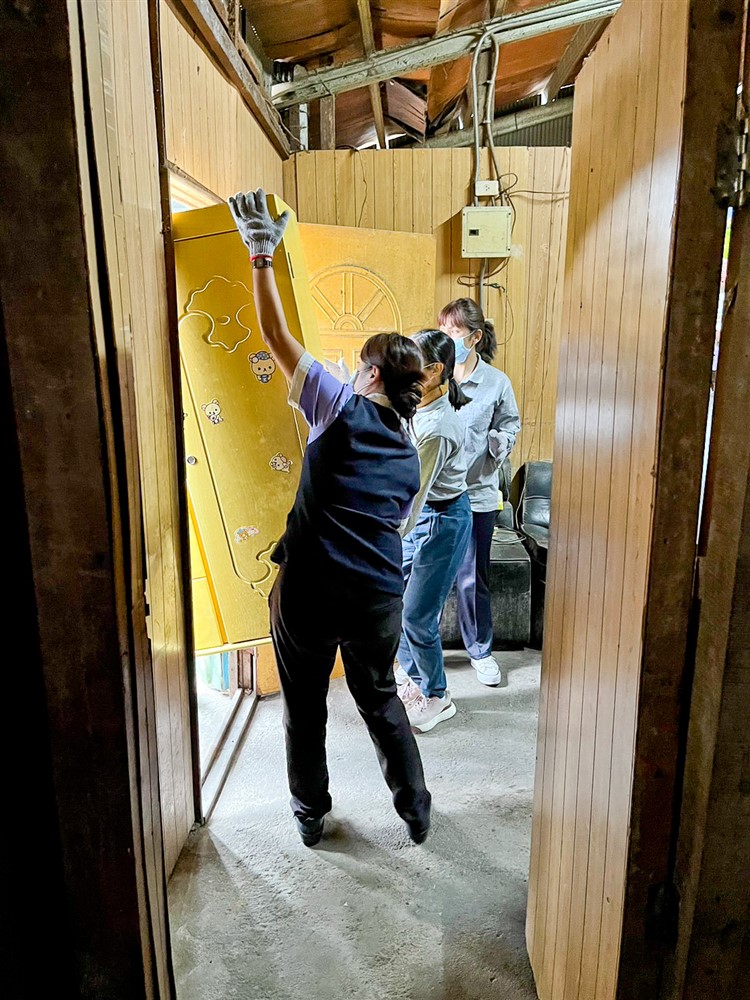上午九點,護理部、長照室、洗腎室接送司機及輔具平臺志工率先抵達部落。由於家屬願意接受清掃的範圍有限,大家只能盡量讓環境看起來清爽一些,將屋裡屋外的蜘蛛網清除,客廳淨空,擦拭牆面,將物品擺放整齊,再將病床搬進屋內換上乾淨毛毯。