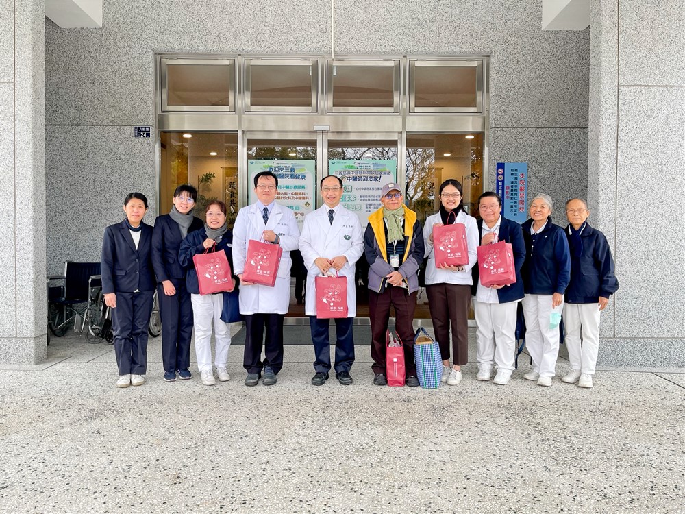 三義慈濟中醫醫院送暖團隊準備出發。左起:劉芸蓁社工、張馨云社工、徐雪玉師姊、張景翔醫師、葉家舟院長、簡俊安醫師、莊孟臻醫師、張雅婷督導、張筱瀅師姊、陳玉霞師姊。