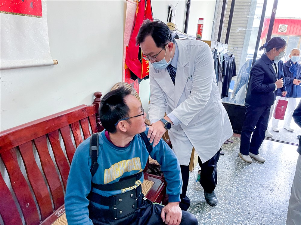 接著轉往探視吳先生,兩個兒子陪著爸爸出來等候。吳先生因車禍工傷導致臥床,他是家庭主要經濟支柱,孩子與妻子頓時失去依靠,幸好熱心民眾通報慈濟。吳先生表示身體已恢復到可以上班,但還是會間歇疼痛,舉手的角度也受到限制,體力大不如前。張景翔醫師仔細評估,親自示範緩解疼痛的運動,期能幫助他不必一直依賴止痛藥。吳先生目前還會到台中慈濟醫院回診,訪視志工建議平時可就近在三義慈濟中醫醫院做針灸治療。