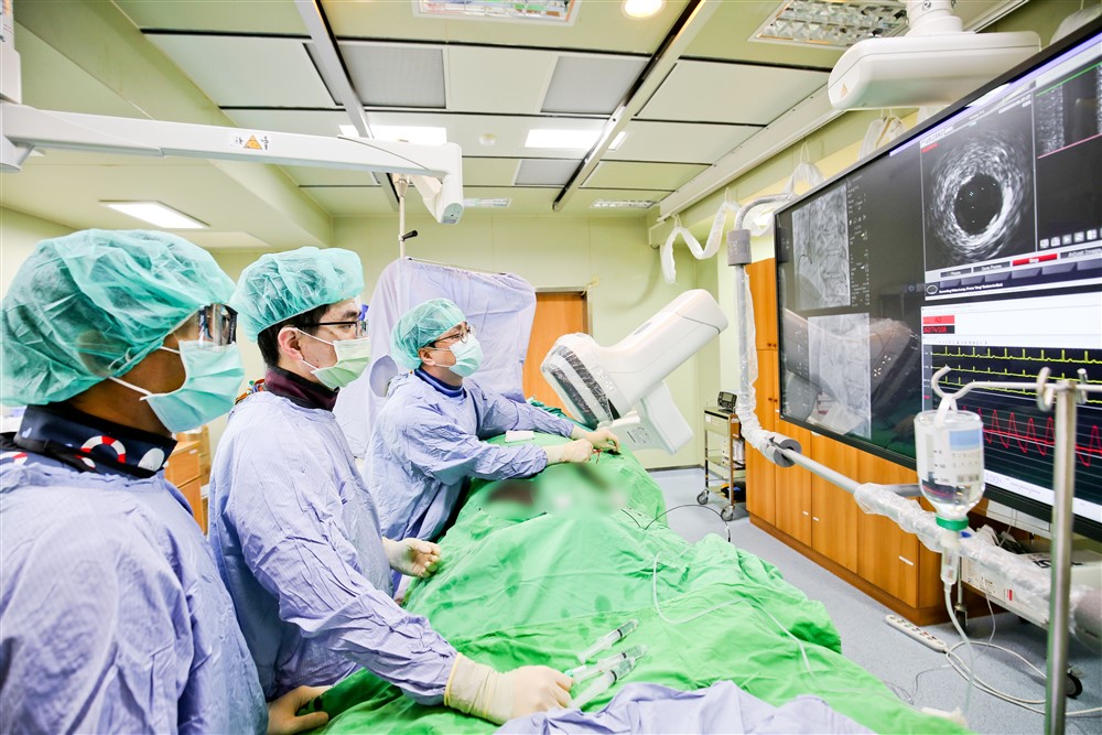 內科部副主任、心臟內科陳郁志醫師(左三)帶領團隊使用新一代「心臟血管攝影X 光機」執行術式。