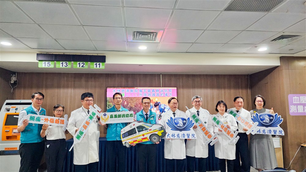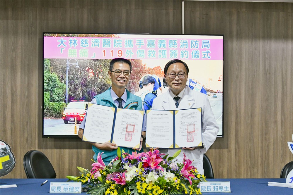 大林慈濟醫院攜手嘉義縣消防局,為「減輕病人疼痛」、「提升到院前救護能力」、「提供醫護團隊支援到院前救護現場的急救處置」等到院前救護,於四月十六日上午,由大林慈濟醫院賴寧生院長與嘉義縣消防局蔡建安局長在大林慈院簽訂合作備忘錄,雙方展開具體合作,共同制定疼痛管理方案,以確保到院前救護病人,在緊急情況下能夠及時獲得有效疼痛緩解。