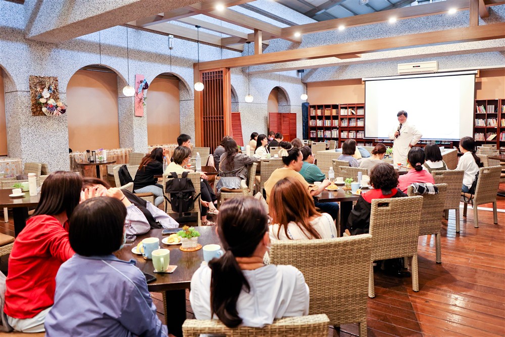 花蓮慈濟醫院與太魯閣晶英酒店舉辦安心講座,心理治療及諮商中心主任林喬祥分享安心五寶關懷同仁。