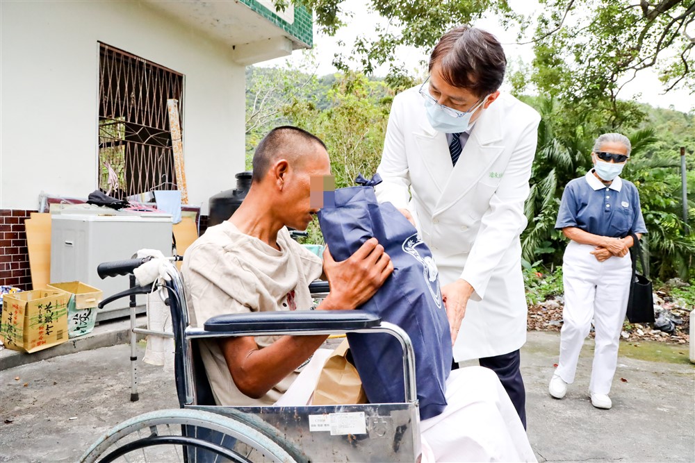 潘永謙院長關懷邱大哥身體狀況,並送上健康素粽及關懷物資。