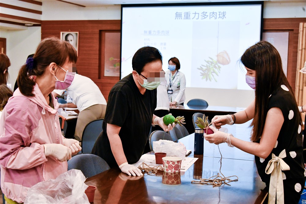 花藝設計師文美琳(右)帶領病友及家屬們手作「無重力多肉球」。