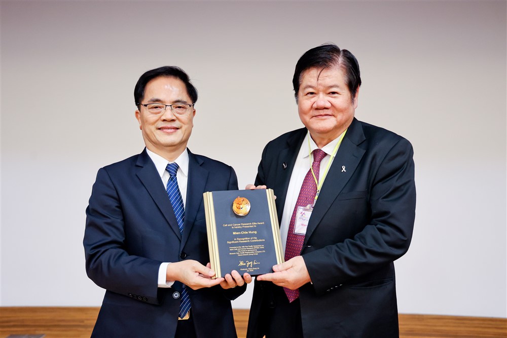 林欣榮院長(左)頒發傑出研究成就菁英獎表揚洪明奇院士(右)對細胞及癌症研究的貢獻。