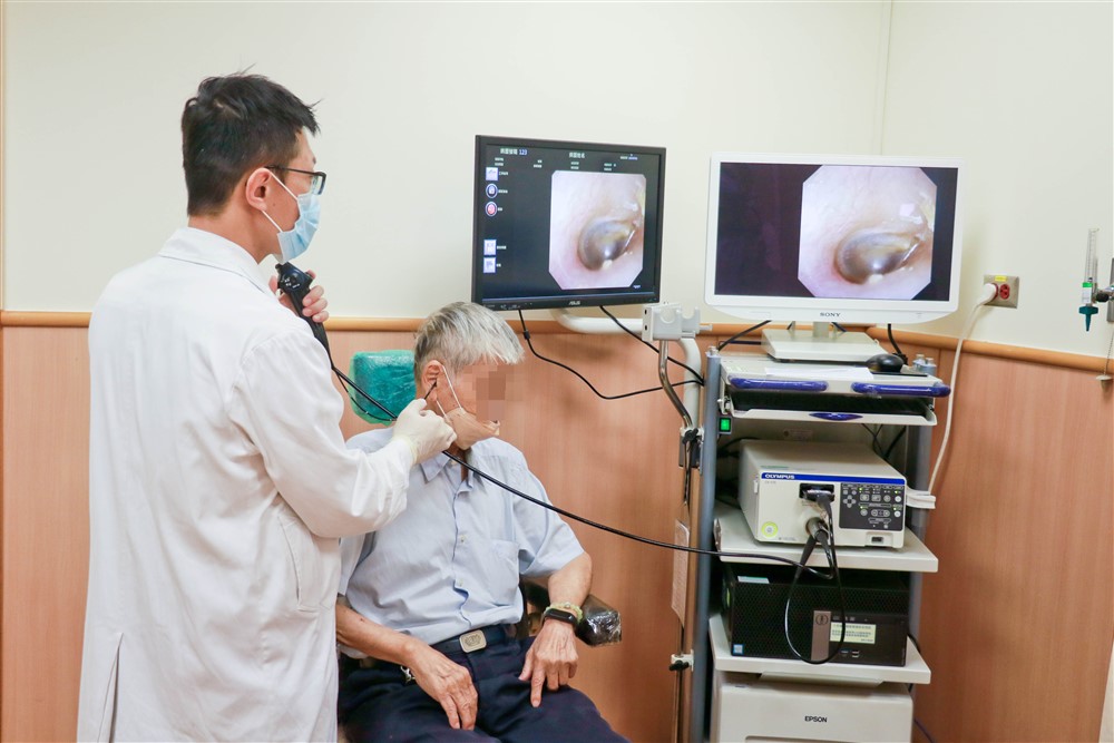 周一帆主任透過內視鏡為耳咽管功能障礙病人檢查耳膜狀態。