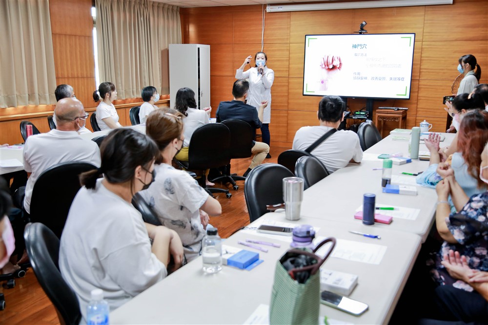 中醫師陳佳蓉帶領病友學習放鬆安神的穴位按摩。