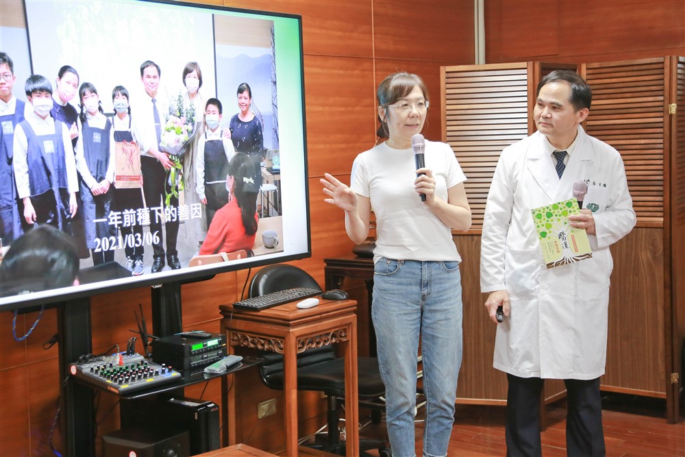 朱女士分享自身經歷,為簡院長(右)及醫療團隊打一百二十分的滿意度。