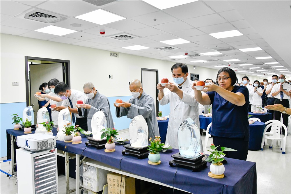 斗六慈濟醫院七月吉祥祈福會由靜思精舍師父帶領大眾禮敬諸佛。右一為雲林縣衛生局曾春美局長,右二為簡瑞騰院長。