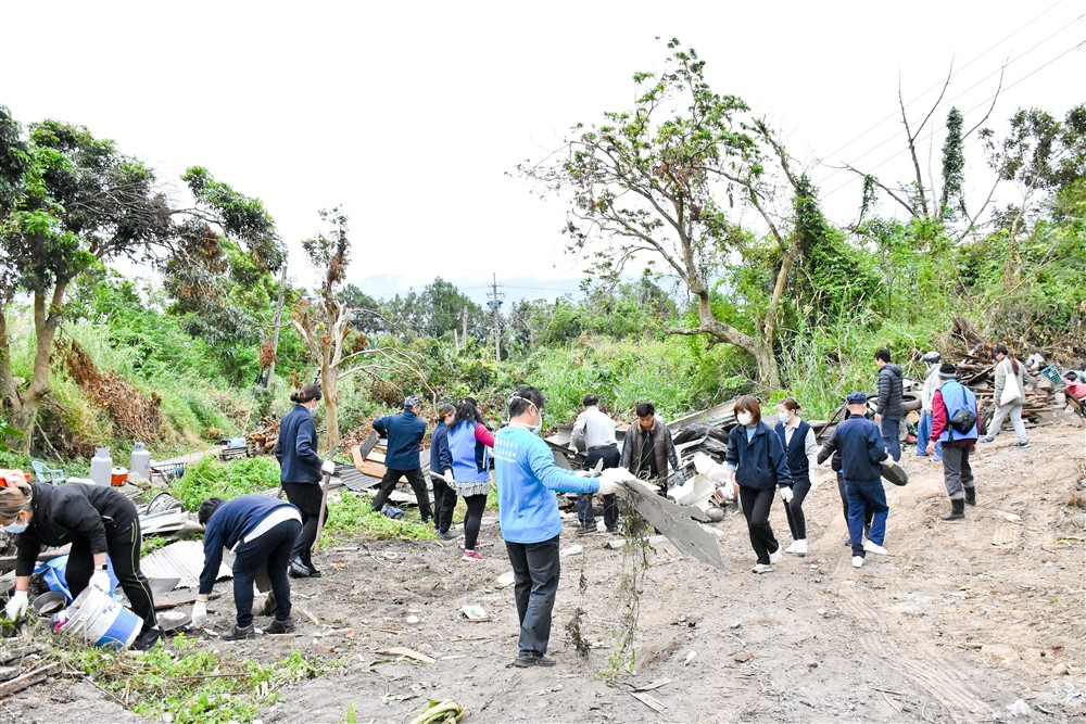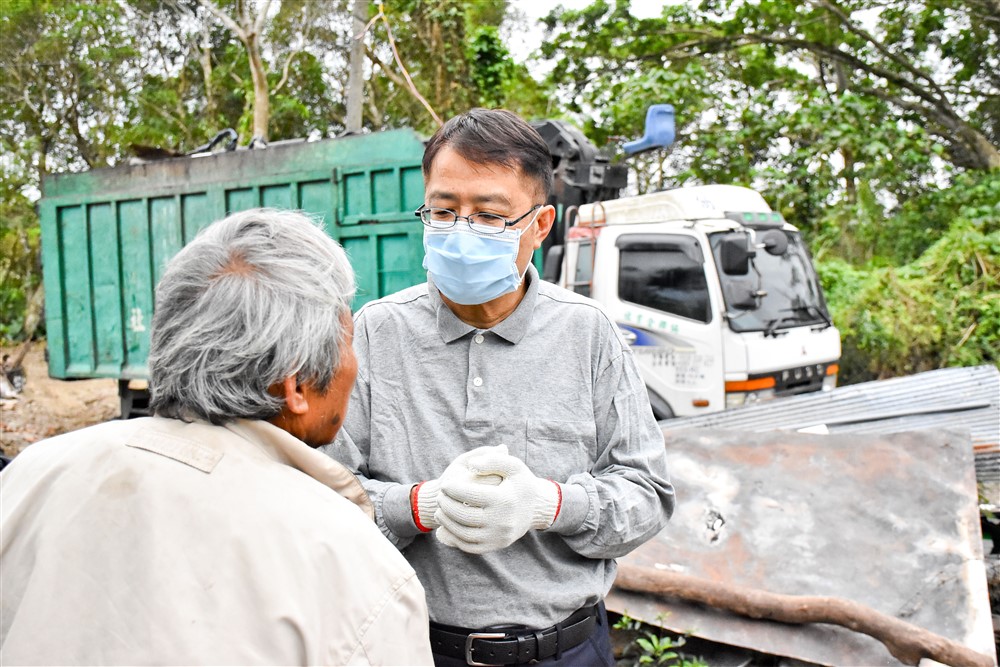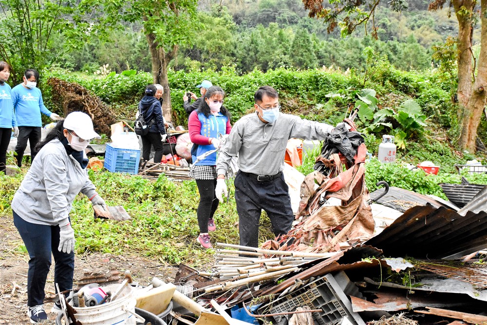 行經環鎮車道而上,再左轉沿平坦小徑前行,下車徒步一百公尺就可抵達阿公的家。半倒的老屋已不在,在等候抓斗車夾取大型廢棄物之際,潘院長先向阿公說明來意,送上衣物和民生用品為阿公添暖,接著與彭成豐鎮長、關山救國團及慈院同仁投入清理工作。眾人將可再利用的木頭撿拾集中,而破損吹落的鐵皮、不堪使用的物品則一一搬運上車,由里壠里里長吳慶郎及慈濟志工陳卓瓊華協助載送清運。