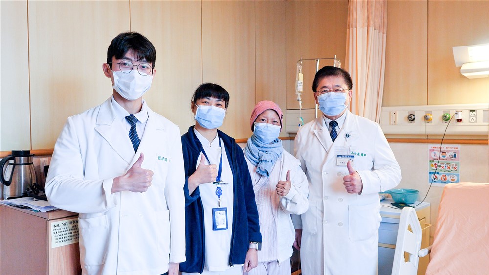 在台北慈濟醫院醫療團隊的守護下,罹患血癌的陳女士順利完成骨髓移植,平安出院。右一為高偉堯主任。攝影/傅長新
