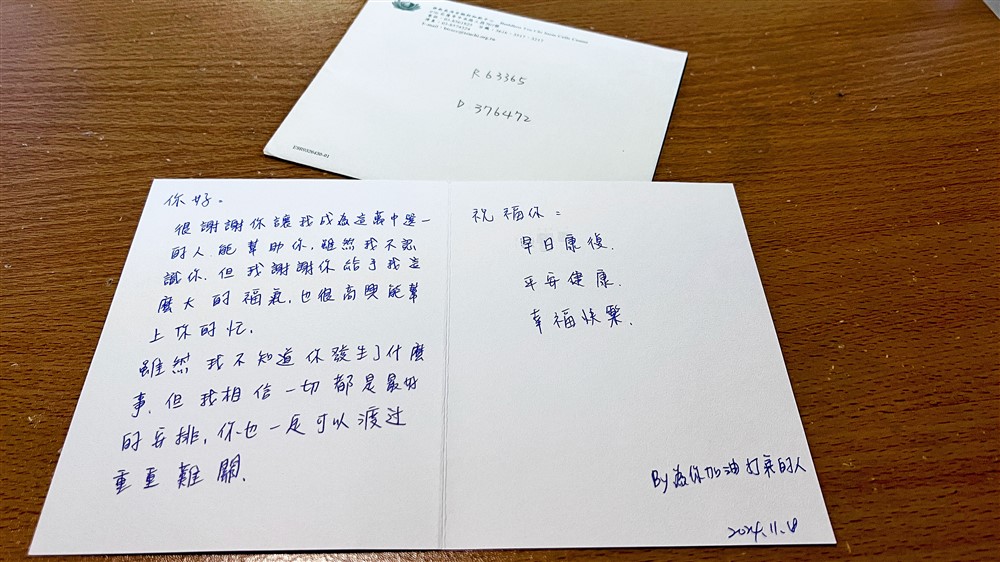 捐贈者特別準備祝福小卡為陳女士加油打氣。攝影/盧義泓