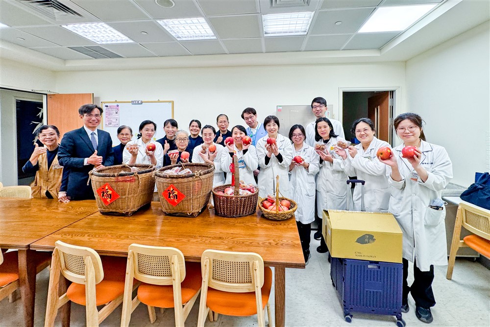 林美株師姊花費半年時間,為六A 病房團隊製作獨一無二的拼布零錢包,搭配精美宮燈吊飾作為春節小禮物。六A 護佐張雯萍感動地說,懿德爸媽每次來醫院都會來看看大家,讓人感受到家人般的親切感;懿德家族準備書法扇子送企劃室與院長室同仁,許權振副院長代表回贈小點心,祝福大家甜甜過好年。