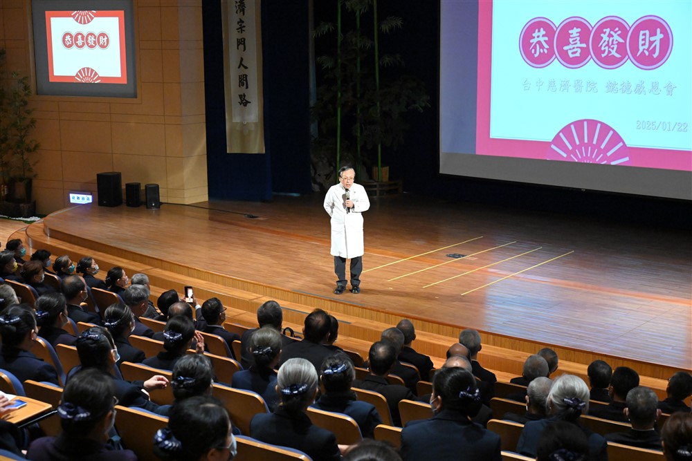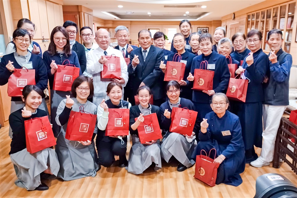 簡守信院長感恩師兄師姊的護持。他回顧過去一年,醫療環境充滿挑戰,但同仁憑著團結與默契,克服困難,尤其在疫情期間,志工的陪伴與關懷,讓醫護人員深受鼓舞。他勉勵大家,在工作與生活中都應該秉持慈悲心,為社會帶來更多溫暖與善念。