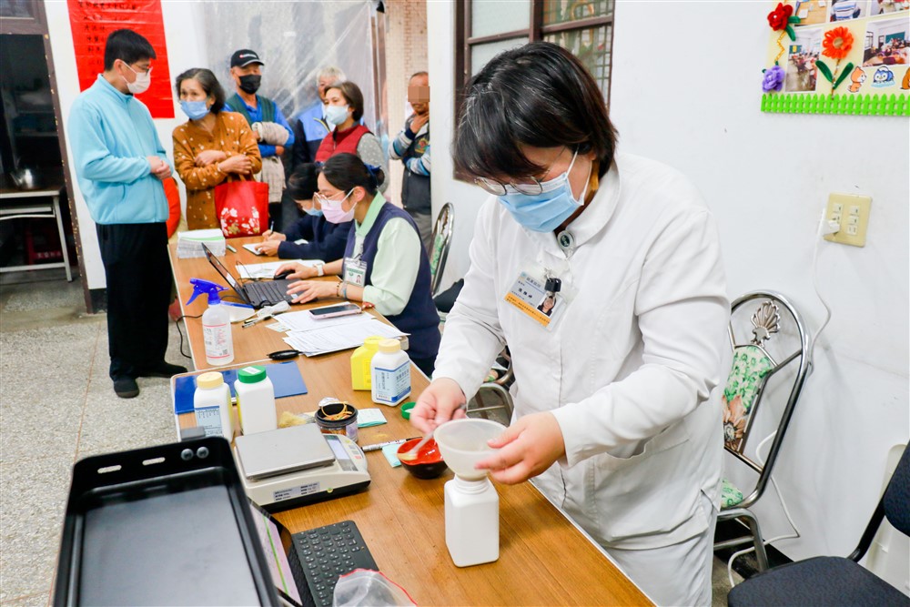 護理督導張雅婷俐落地盛裝中藥,避免居民久候。