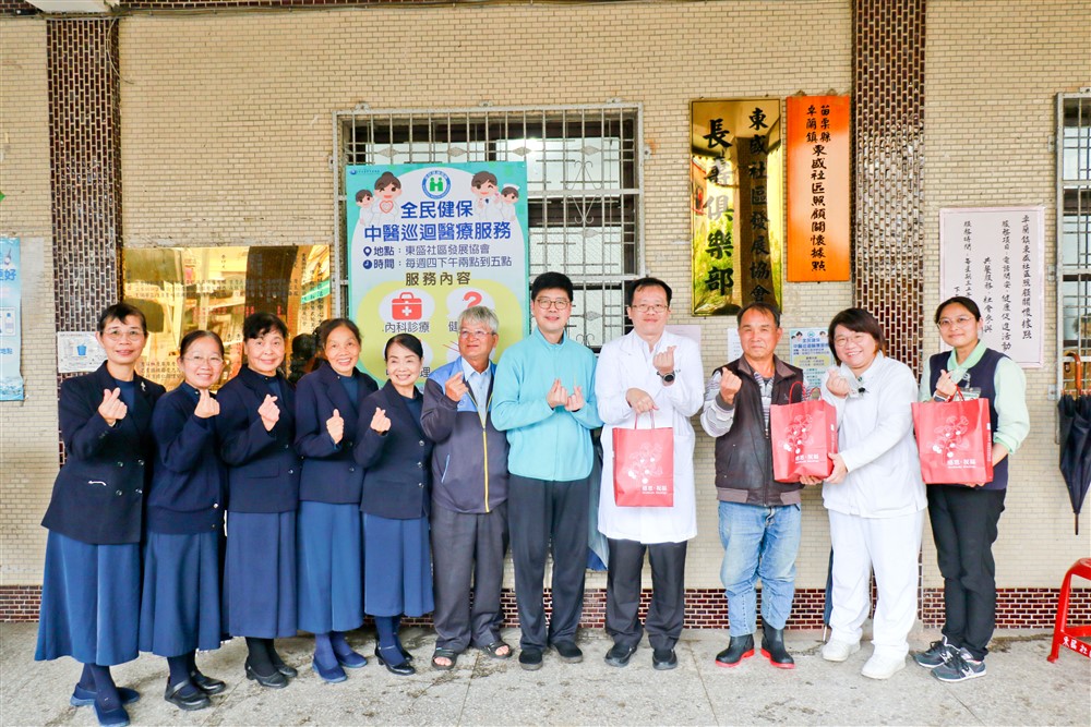 三義慈濟中醫醫院新增巡迴醫療據點,三月十三日起每週四下午在苗栗縣卓蘭鎮東盛社區活動中心提供診療服務,首航由中醫師張景翔(右四)率隊服務。