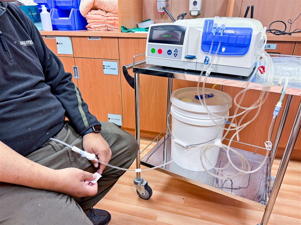 在陳一心主任建議下,孫先生選擇腹膜透析治療,利用人體的腹膜過濾廢物,腎友只需每日定時更換透析液,無需頻繁到院治療。孫先生分享,他每天早晨和睡前各執行一次換液,完全不會影響日常生活。孫先生說「其實一開始聽到要自己操作還是有點擔心,但護理師教得很仔細,操作流程也不複雜,只要注意清潔和基本步驟就能完成。」他提到,透析初期,醫護團隊會持續指導,一個月內反覆練習,第二週就能獨立操作,現在更是駕輕就熟。