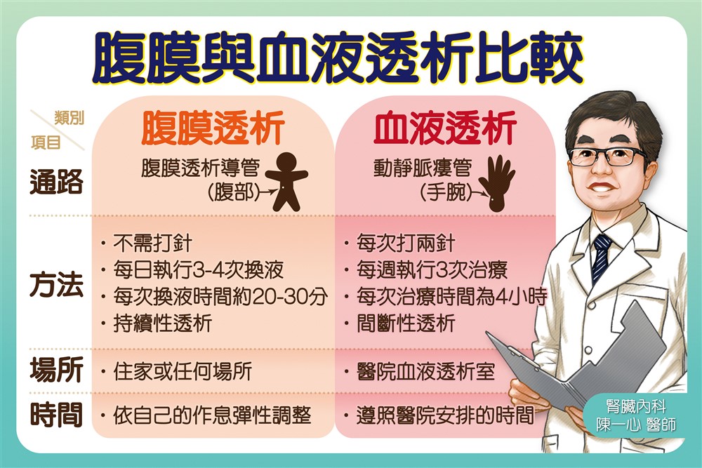 陳一心主任表示腹膜透析與血液透析應依個人需求選擇,沒有「最好」,只有「最適合」。製圖/陳彥儒