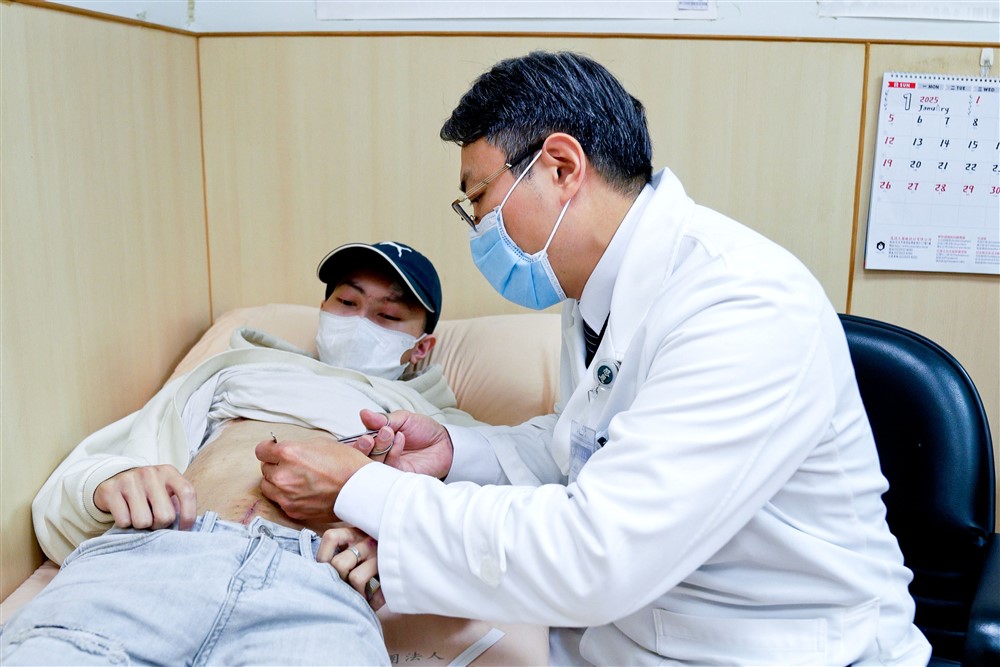 台北慈院一般外科陳家輝醫師為黃先生進行拆線。攝影/盧義泓