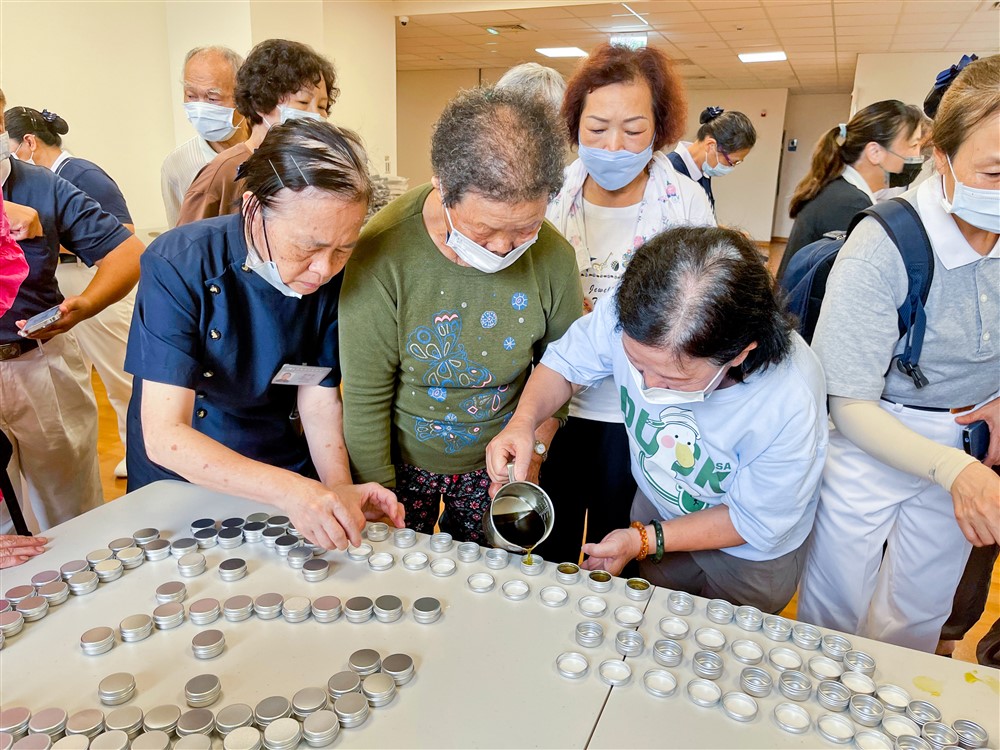 三義靜思堂長照據點長輩也來參加器捐週啟動儀式,親手採摘左手香葉片,並將調製好的左手香香膏溶液裝入鋁罐。吳珮綺阿嬤連續幫四、五位長輩裝罐,動作熟練,她笑說因為每天都在佛龕前幫佛祖倒茶,練出俐落身手。張明農爺爺裝罐動作也很流暢,他說自己有泡茶習慣,裝罐動作就和倒茶動作一樣,也間接訓練了手眼平衡。