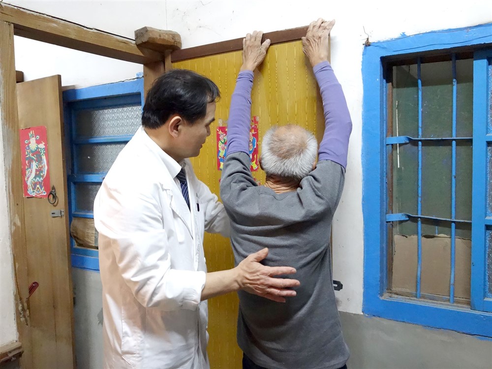 第二站來到水林鄉,關懷七十三歲獨居的黃先生,黃先生是丹娜絲風災受災戶,下雨時家中會漏水,被社區通報關懷。他平時靠撿回收為生,因頸部及胸部肌張力障礙,有駝背、歪頭的狀況。簡院長為他檢查後,教他簡易的伸展運動,提醒若病情繼續惡化,可能影響消化與生活品質。