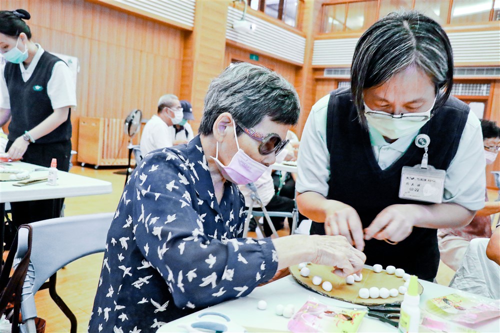 台中慈濟醫院社區健康中心主任賴怡伶(右)陪伴長輩一起製作齒模。