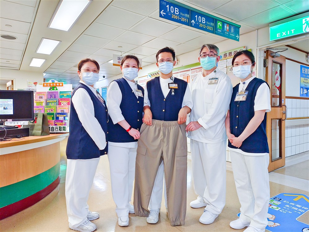 大林慈院護理部陳佳蓉主任(左二)代表感恩魏靖倫(中)的義舉,與團隊送他一件新的休閒褲。