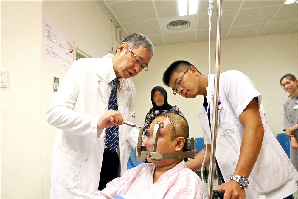 花蓮慈院於二○○三年十月引進加馬刀精準治療,至今已守護兩千位病人。圖為神經腫瘤科蘇泉發主任(左一)仔細為病人檢查定位。攝影/魏瑋廷