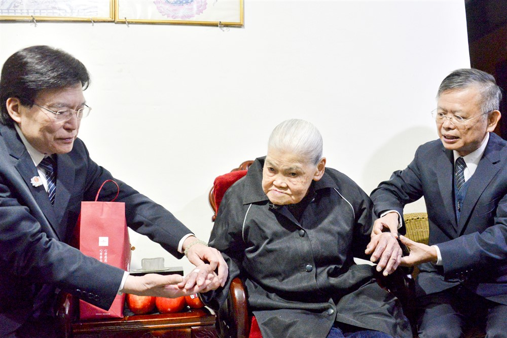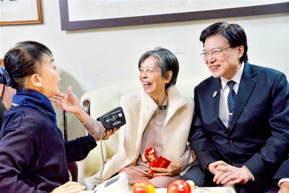 一九七三年,人稱老三師姊的胡玉珠師姊皈依上人,曾為了接送上人學開車,並協助整修樂生療養院朝陽舍。如今師姊雖然年邁,依舊耳聰目明。趙院長送上福慧紅包,並替師姊圍上圍巾,滕安娜副主任量測血壓,張恒嘉副院長詢問身體狀況,老三師姊也閒不住,頻頻起身端來水果、糕點。離開前,喬主祕叮嚀:「要保重身體,只要有事情一定要記得找我們,一定要說!」