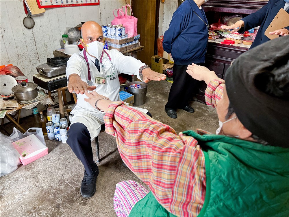 居家關懷自二月七日重啟後,陸續在花蓮縣玉里鎮、富里鄉、卓溪鄉、瑞穗鄉、萬榮鄉等地區進行訪視,由轄區主責志工帶路至個案家中訪視。今年由周達利醫師帶隊,他說,在玉里服務將近十年的時間,一直很想走進社區去關懷,尤其是需要幫助的個案,而現在終於有機會能夠付出,讓他很感恩。為了和部落原民阿嬤拉近距離,周醫師介紹自己時,打趣地說:「我是布農的啦!」沒想到阿嬤立刻拆穿周醫師的幽默,逗得眾人大笑,雖然周醫師獨特的口音常需要跟診或隨行護理人員幫忙翻譯,但親和力不減!周醫師鼓勵個案要勤勞地起身活動筋骨,親切傳授簡易運動預防跌倒,除了關心個案身體狀況、評估用藥單,數週以來更是連續準備水果跟蔬食便當跟個案結好緣。