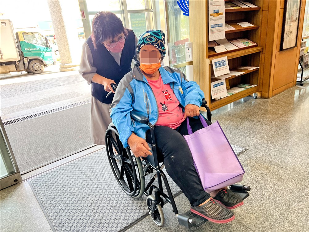 右圖:李阿嬤在居家關懷團隊的安排下,順利來到玉里慈院,社工邱麗華陪伴她看診。