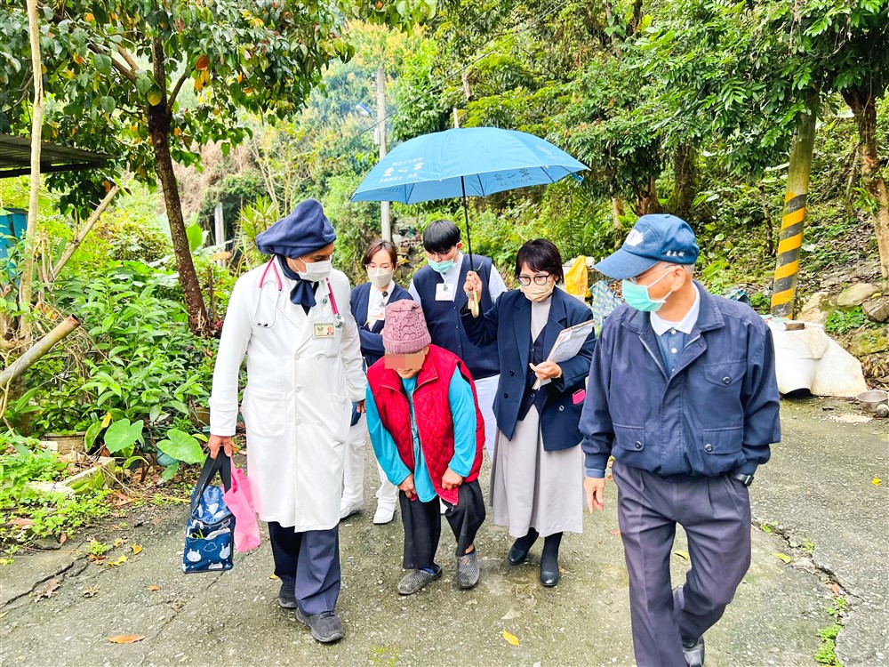 揮別疫情,玉里慈濟醫院居家關懷再度出發,由周達利醫師(左一)帶隊,慈濟社區志工協助帶路前往個案家中。