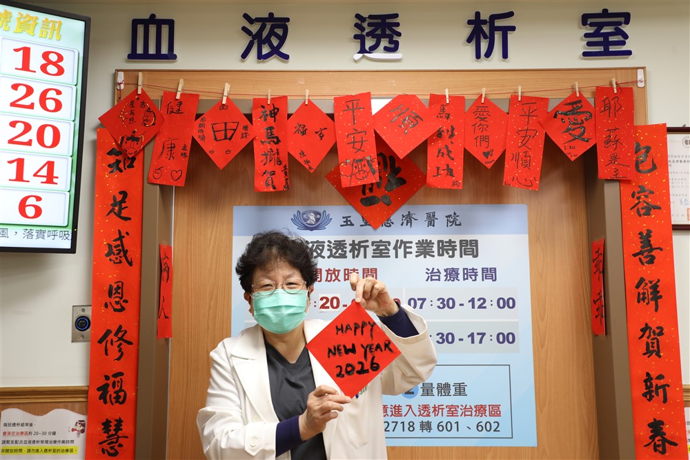 陳岩碧院長在繁忙的臨床工作與急診值班中,特地撥空親自參與別具意義的寫春聯活動,與腎友及同仁一同提前感受農曆新年的喜氣,有別於傳統春聯常見的吉祥詞句,陳岩碧院長別出心裁,用英文寫下「HAPPY NEW YEAR 2026」向大家送上祝福,寫完後還幽默地說:「結果2026這四個數字寫得最漂亮」引來現場同仁一陣大笑,氣氛更加輕鬆愉快。
