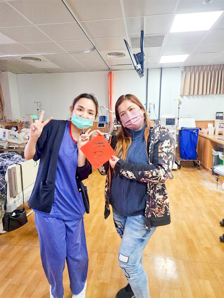 活動期間,也出現溫馨的文化交流畫面。陪伴腎友的外籍看護麥拉與麗莎,她們已經來臺灣幾年的時間,學會一點中文,欣然接受邀請,寫下「財」與「吉」等字,簡單的筆畫之中,流露出跨文化的參與感,也象徵祝福與好運,入境隨俗一同迎接農曆新年前的歡喜與期待。