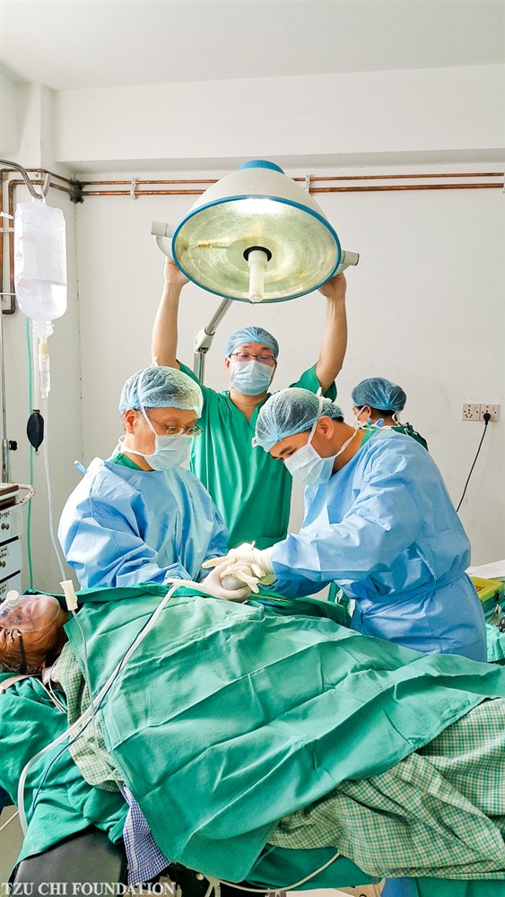 二○一五年,尼泊爾發生芮氏規模七點八強烈地震,慈濟勘災醫療團前往巴塔普癌症醫院,與當地醫護人員一起為受傷病患進行手術治療。圖左二為台中慈院簡守信院長,左一為關山慈濟醫院潘永謙院長。攝影/蕭耀華