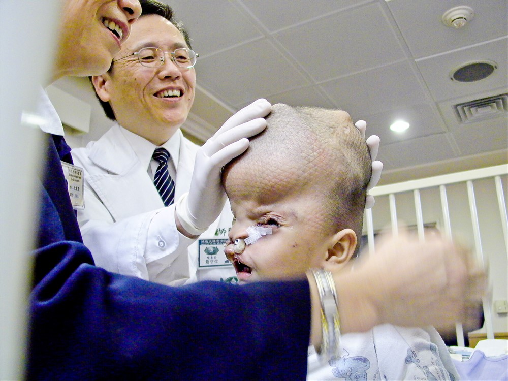 簡守信醫師擔任大林慈濟醫院院長期間,為菲律賓的傑博動手術。傑博因出生嚴重的兔唇、地中海貧血、水腦,造成頭骨與腦部無法正常生長,菲律賓慈濟人帶他來到大林慈院手術尋求生機。圖/大林慈院提供